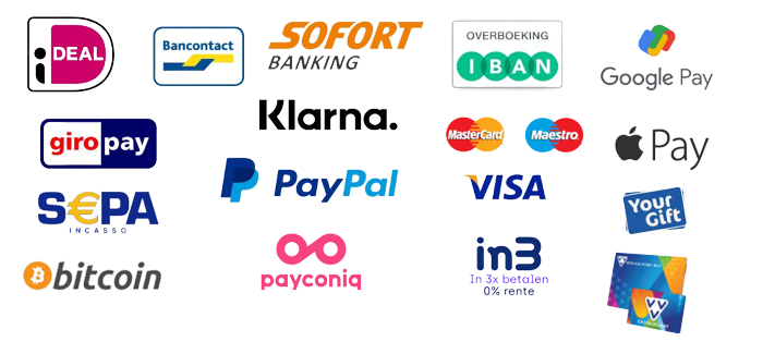 Onze webshop is uitgerust met een beveiligde, gecontroleerde SSL-verbindingen, HTTPS-beveiligingscertificaat.Ook werken wij samen met een online betaaldienstverlener (PSP) Pay.nl, die online betalen veilig mogelijk maakt onder toezicht van De Nederlandsche Bank. (De Nederlandse Bank). Op deze manier kunnen wij u een breed scala aan verschillende betaalmethoden aanbieden.