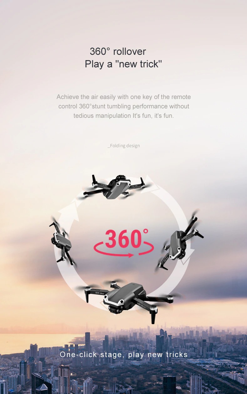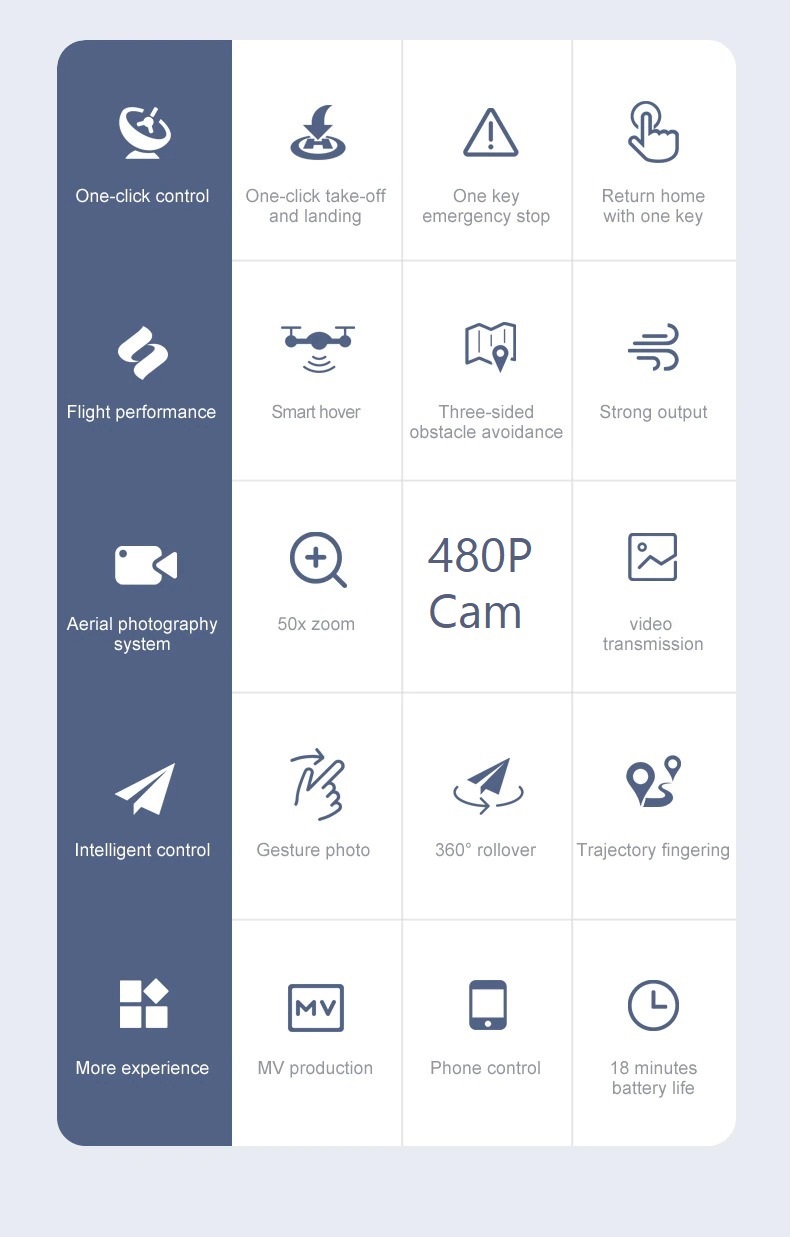 Met de ingebouwde 480P simpele voor en onder camera kun je snel video’s en foto’s maken en deze direct delen via social media of opslaan op je smartphone. De drone heeft een ingebouwd 6-axis gyro systeem die ervoor zorgt dat de drone gemakkelijker kan opstijgen en zweven. Met een simpele toets op de knop zorgt je er tevens ook voor dat de drone naar de plek van opstijgen terugkeert. De drone heeft daarnaast ook een ingebouwde truc waarmee het 360 graden draait.