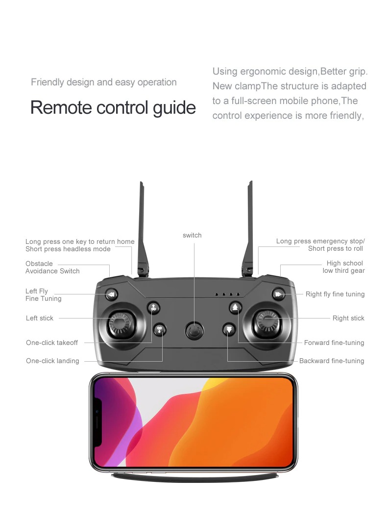 – FPV: Je kunt de smartphone in een virtuele bril stoppen en met de controller de drone bedienen. Hiermee zie je wat de drone ziet. (let op! exclusief virtuele bril).