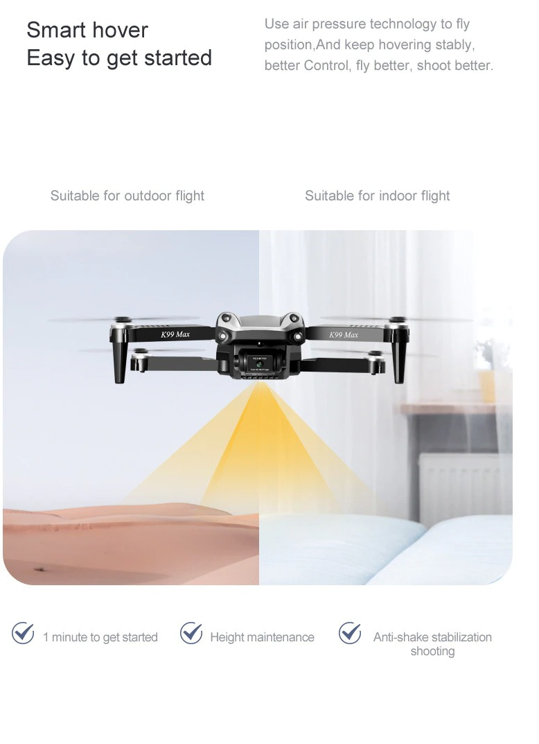 – Stevige behuizing: De romp van de quadcopter is gemaakt van zeer sterke engineering PVC. De materiaal is licht in gewicht en kan tegen een stoot.