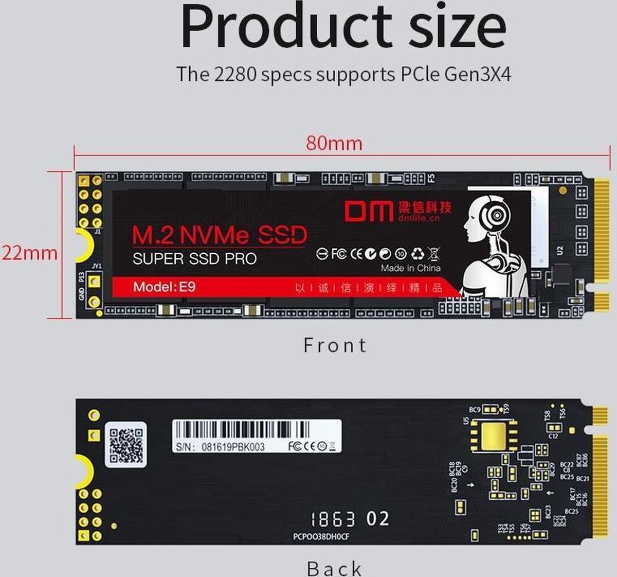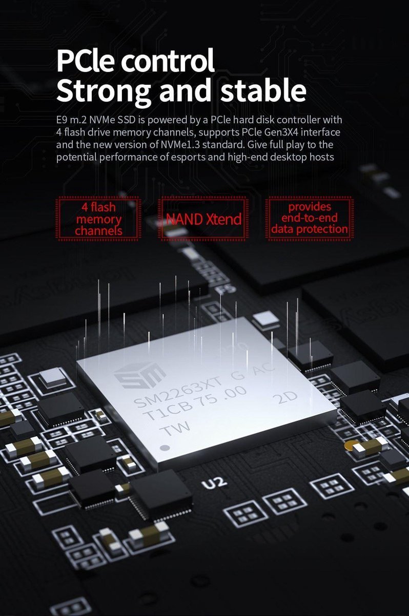 E9 m.2 NVMe SSD aangedreven door een PCLe-harde-schijfcontroller met 4 geheugenkanalen voor flashdrives, ondersteunt de PCLe Gen3X4-interface en de nieuwe versie van de NVMe 1.3-standaard. Geef volledige speelervaring voor een potentiële prestatie van esports en high-end desktop-hosts.