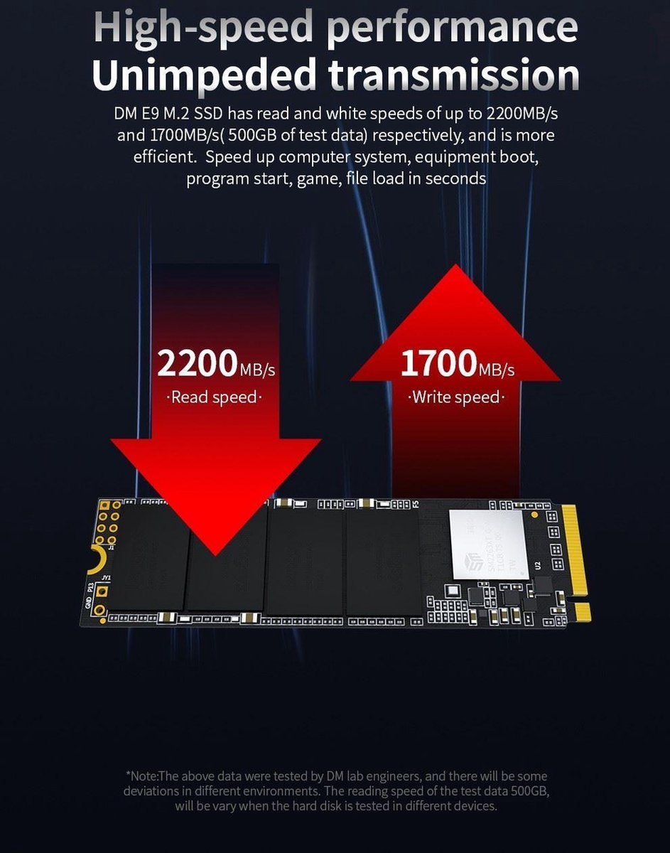 De DM E9 m.2 SSD heeft lees- en schrijfsnelheden tot respectievelijk 2200mb / s en 1700mb / s (500 GB testgegevens) en is efficiënter. Versnel het computersysteem, het opstarten van de apparatuur, het starten van het programma, het spel, het laden van bestanden in seconden.