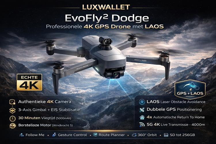 LUXWALLET EvoFly ² Dodge – 45Km/h – 4K GPS Drone – 4KM – Obstakel Ontwijken – 5Ghz WiFi – Gimbal 3-As – Micro SD – Professioneel