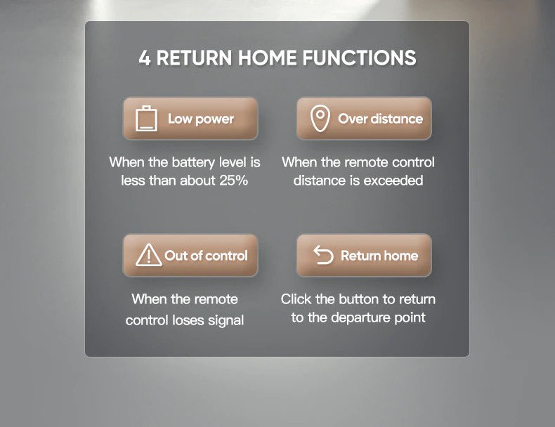 – GPS terugkeer functie: Is de accu bijna leeg? Geen probleem. De drone vliegt automatisch terug naar de punt van opstijgen wanneer de accu leeg is of als de signaal verloren is. Je kunt ook met 1 knop de drone terug laten vliegen. Je hebt dus totale controle.