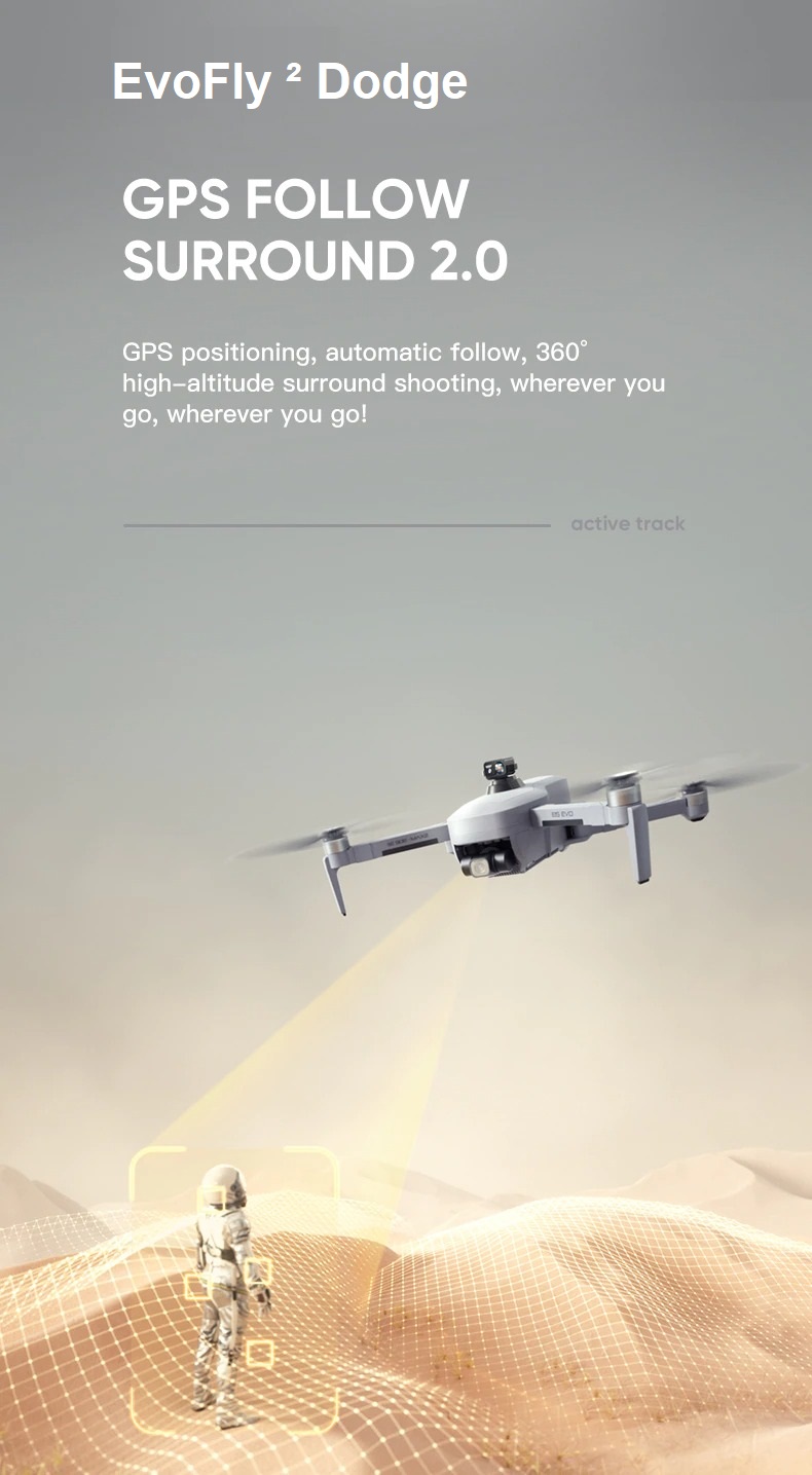– Volg Mij Modus via GPS 2.0 Surround: De EvoFly ² Dodge volgt je automatisch met de ‘’Volg Mij’’ modus. De vernieuwde systeem beschikt over kunstmatige intelligentie om je overal (360 graden) te volgen. De camera zal je tot 30 meter waardoor je complexere foto’s en video’s kunt maken, zonder je zorgen te maken over de besturing van de drone.