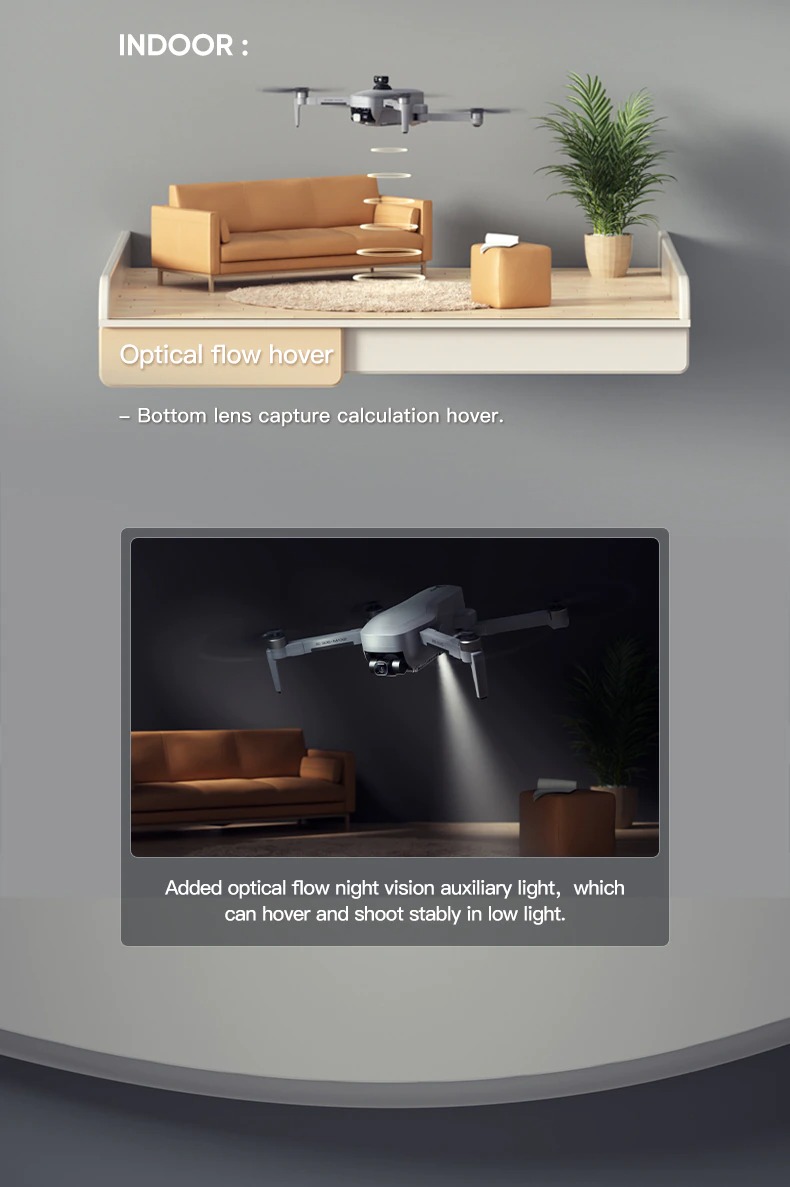 – Optische Positionering: De drone kan door de krachtige borstel loze op een vaste punt blijven zweven, zelfs tijdens een harde wind. Je kunt hierdoor ook betere foto’s en video’s nemen.