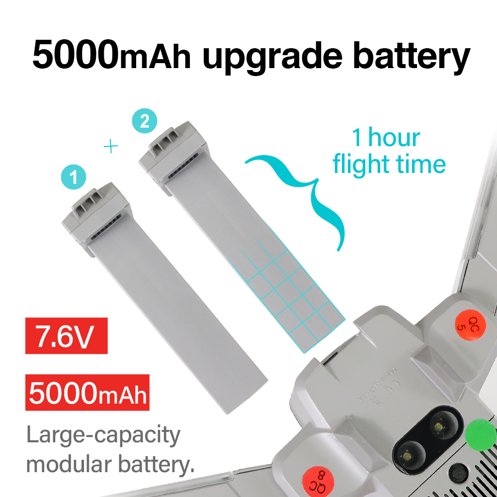 – 30 minuten Max Vliegtijd: Door de hoge capaciteit 7.6V 5000mAh intelligente batterij kun je tot 30 minuten vliegen met 1 accu. Je ontvang in totaal 2 accu’s en heeft dus een maximaal vliegtijd van 1 uur.