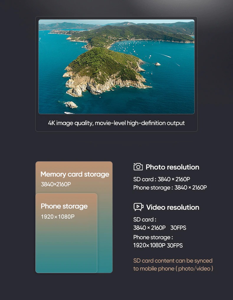 – 5G WIFI functie: Hiermee kun je alle foto’s en video’s rechtstreeks en direct opslaan op je smartphone. Er is ook ruimte voor een Micro SD kaart tot 128GB.