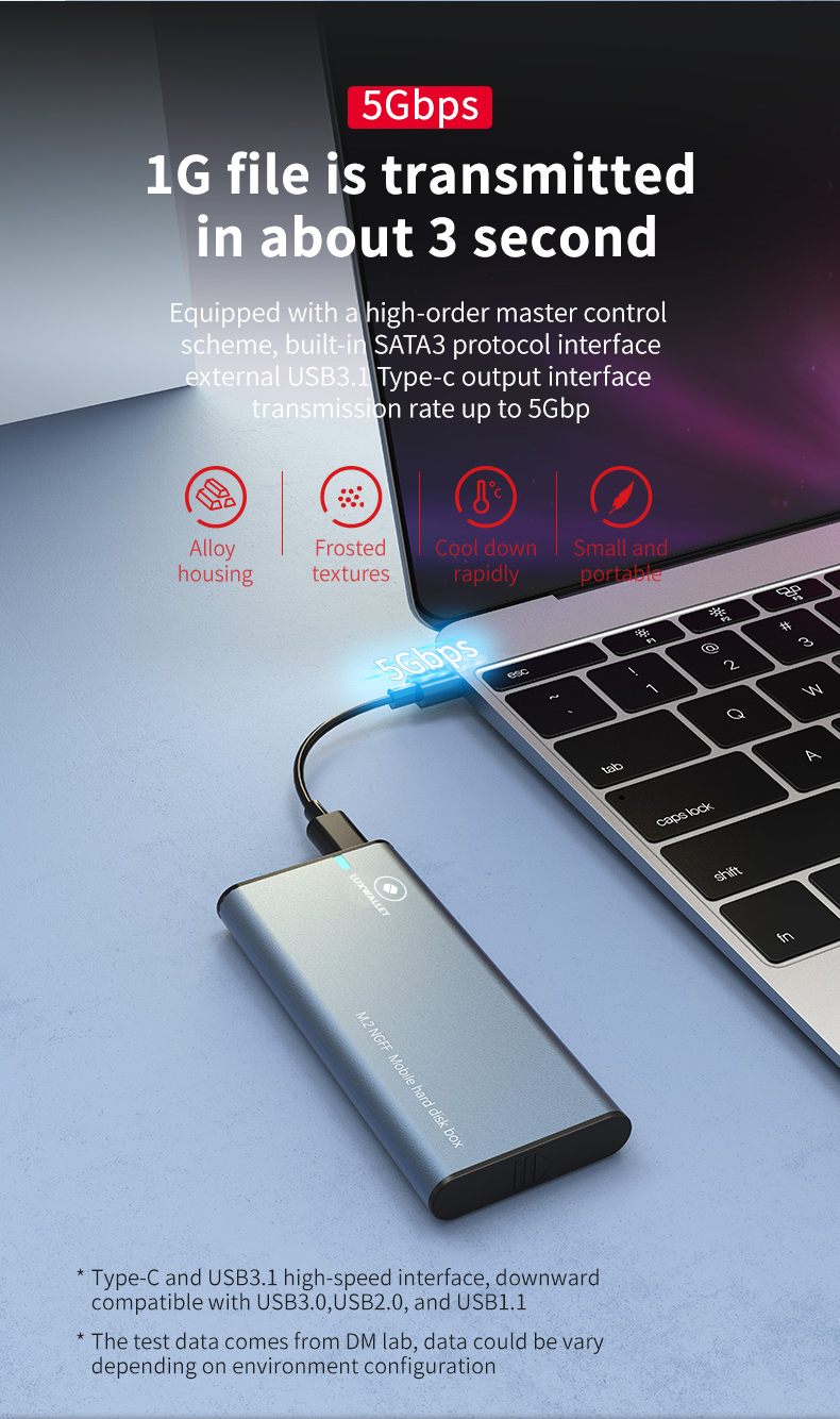 USB 3.1 Gen2 NGFF/ B&M/B key: Met de Type-C 3.1 Gen2 B&M/B Key M.2 NGFF SSD Externe behuizing kun je je nieuwe generatie M2 Sata-schijven extern gebruiken. Dankzij USB 3.1 Gen2, die een snelle verbinding biedt, biedt hij gegevensoverdracht tot 5 Gbps. Bovendien biedt hij dankzij het UASP-protocol tot 70% snellere gegevensoverdracht dan de standaard USB 3.0-verbinding.