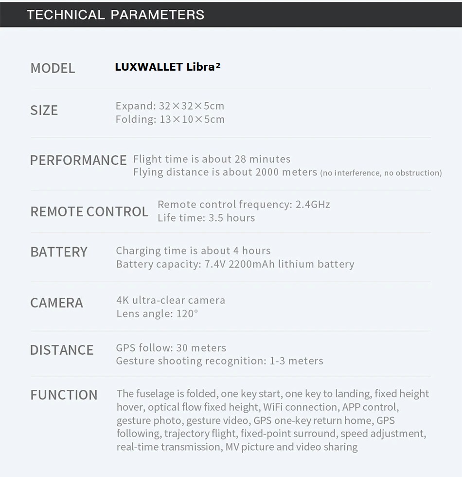 De LUXWALLET Libra GPS Drone weegt slechts 214 gram en valt daarmee onder de A1 klasse. volgens de drone wetgeving. Dit betekend dat je geen vliegbewijs nodig hebt om deze drone te mogen gebruiken, hierdoor is de drone nog altijd de meest toegankelijke drone om mee te beginnen.