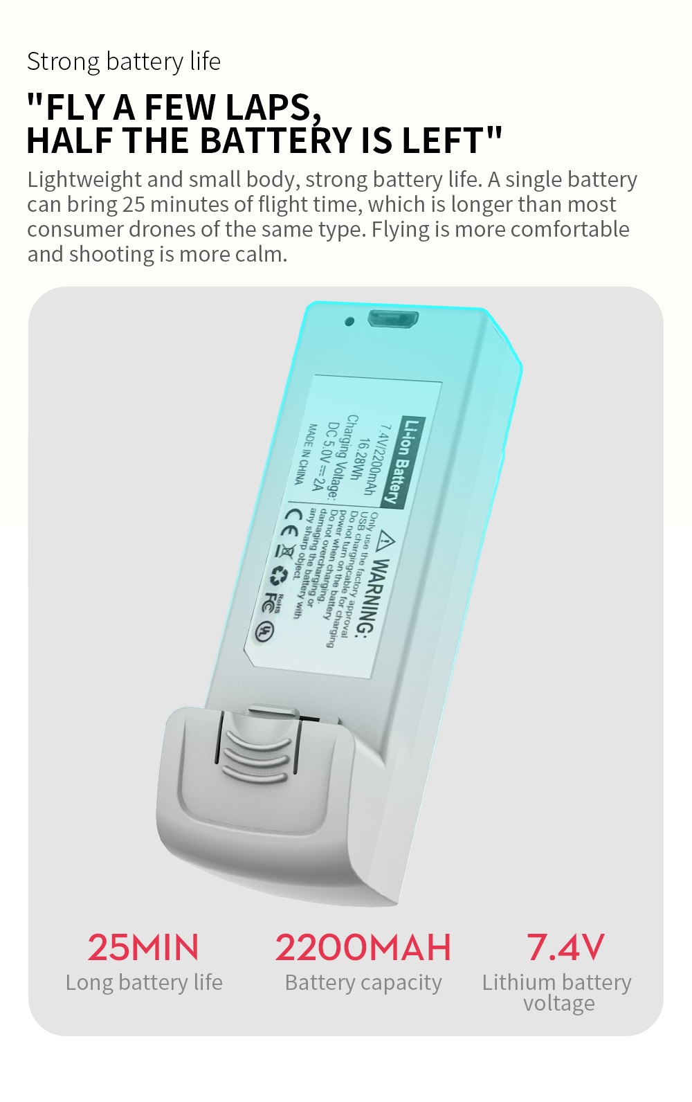 – 28 minuten Max Vliegtijd: Door de hoge capaciteit 7.4V 2200mAh intelligente batterij kun je tot 28 minuten vliegen met 1 accu. Je ontvang in totaal 2 accu’s.