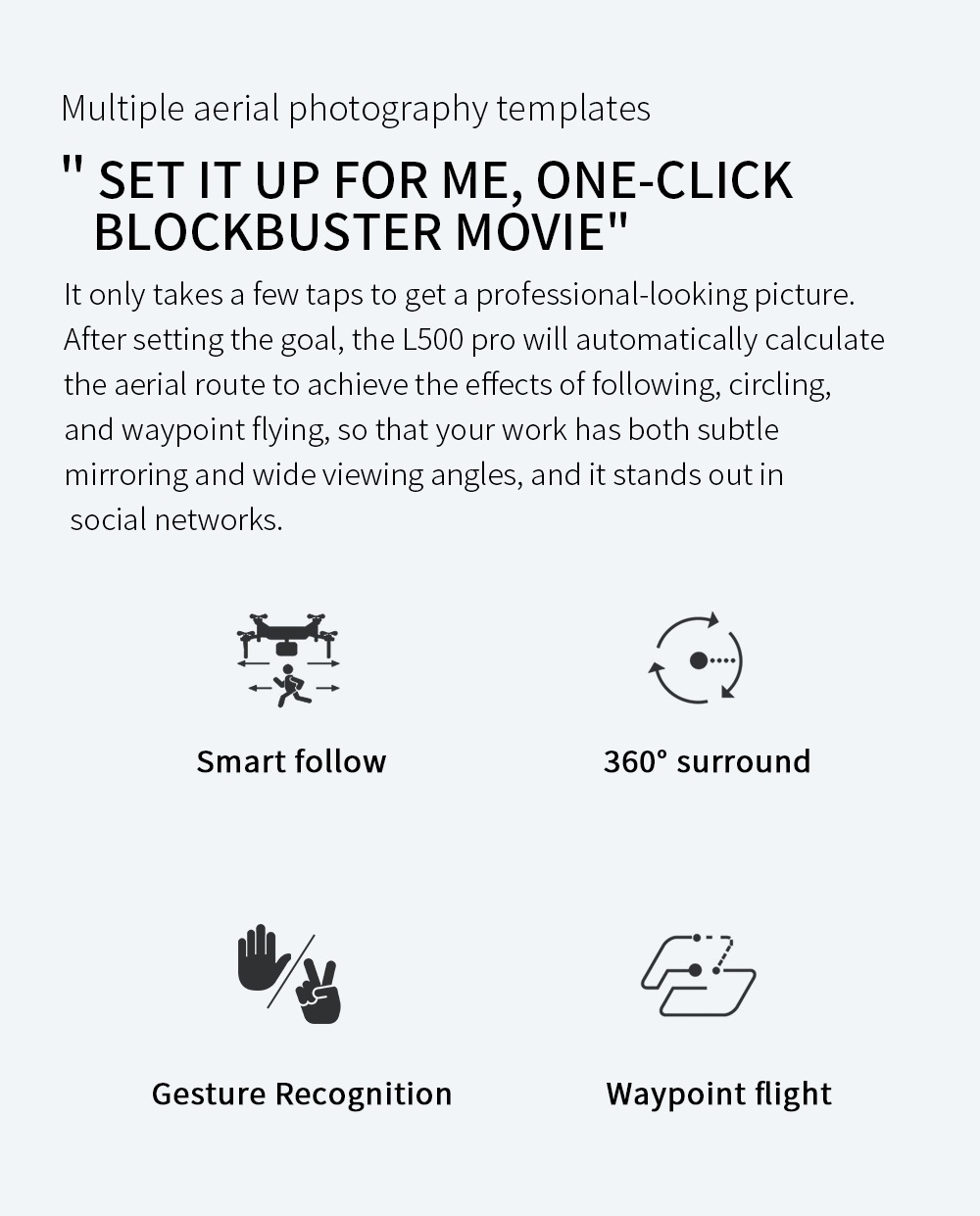 Wil je dat de drone je volgt en wil je de drone tot 30 meter bedienen met je handen? Dit is mogelijk met de Libra Eagle series. Je kunt de ”GPS Volg mij” functie activeren via de applicatie of controller en ervoor zorgen dat de drone je tot 30 meter zal volgen, waar je ook naartoe gaat. Je kunt de drone met speciale handgebaren bedienen tot 3 meter en gemakkelijker foto’s en video’s nemen.