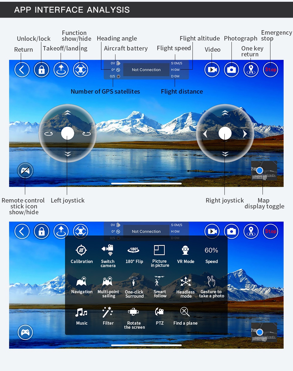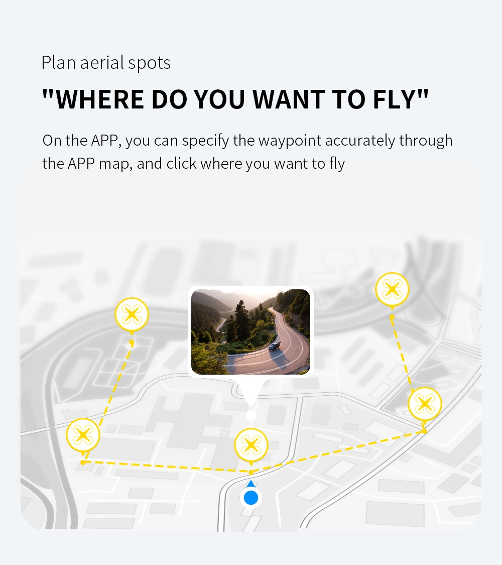 Wil je dat de drone een bepaalde route gaat vliegen? Beweeg je vinger over het scherm en plan de route uit. De drone zal de route die je hebt getekend volgen. Je kunt daarnaast ook gebruik maken van de ”360° vliegsysteem”. Je kunt met deze modus een bepaalde punt aanvinken waardoor de drone om de locatie die je hebt aangegeven in rondjes zal vliegen. Je kunt de mooiste foto’s en films schieten met deze handige opties.