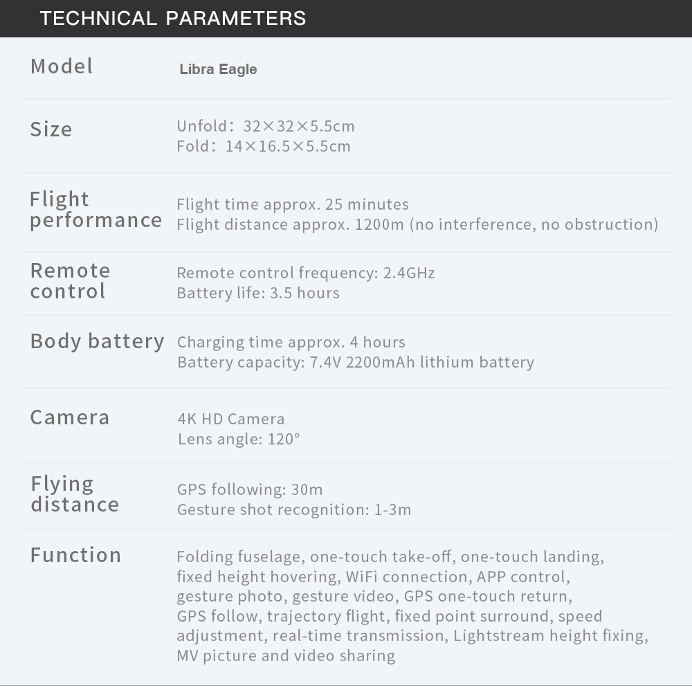 – GPS vlucht zorgt voor een nauwkeurige positionering van de Libra Eagle drone. De drone zal automatisch terugkeren naar de afstandsbediening wanneer de accu bijna leeg is of wanneer de drone geen bereik meer heeft. Zo hoef jij je nooit zorgen te maken om verlies van de drone