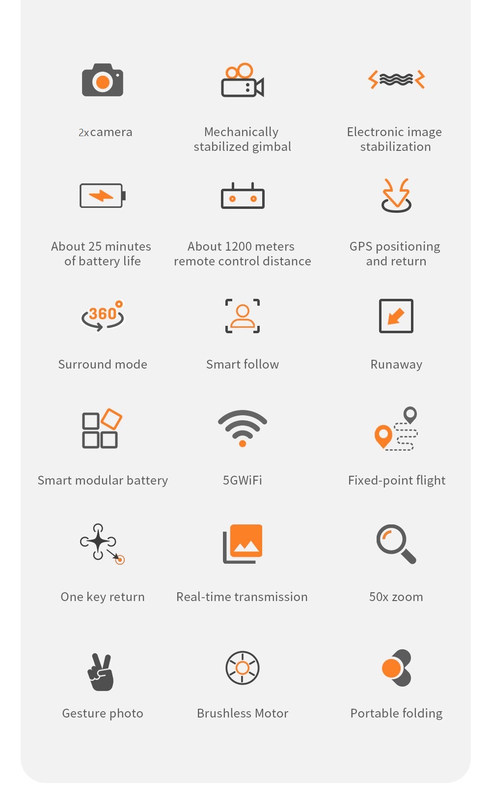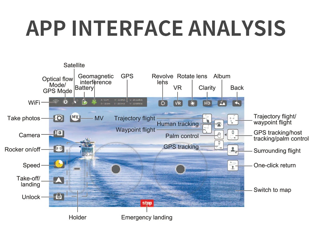 Eenvoudige bediening: Met de ‘’auto-take off’’ knop en ‘’auto-land’’ knop, kan deze camera drone gemakkelijk worden bediend om te starten en te stoppen. In combinatie met de duidelijke pictogrammen in de meegeleverde applicatie voor de smartphone, wordt deze drone eenvoudiger te bedienen, zelfs voor drone beginners.
