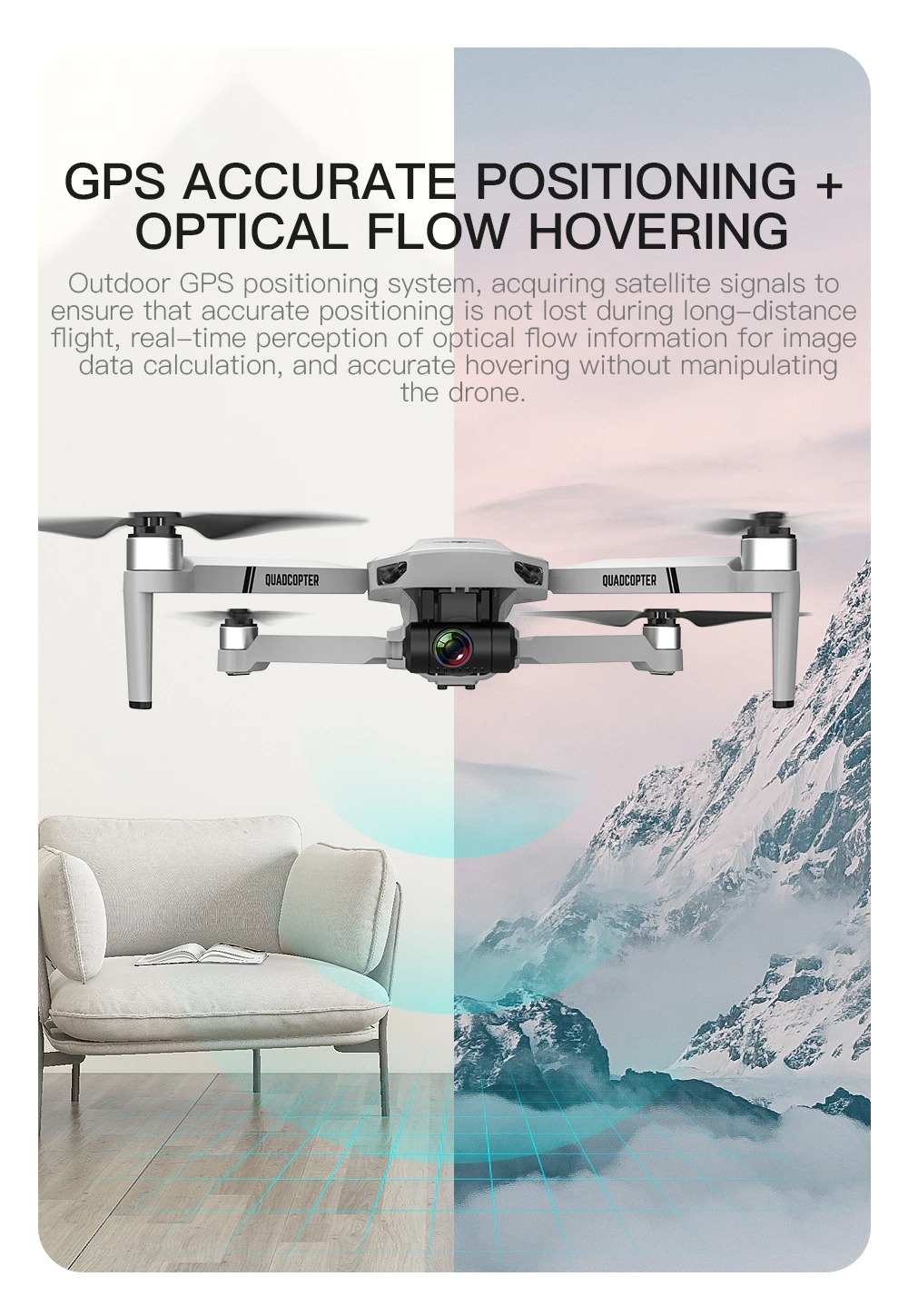Stabiele GPS & RTH: De Libra4 maakt gebruik van een stabiele GPS-positionering en Auto Return (RTH) functie om te voorkomen dat de drone verloren raakt tijdens het vliegen. Er is een automatisch terugkeer functie ingebouwd waardoor de drone automatisch terugvliegt naar de startlocatie. Als de accu leeg is of bijvoorbeeld geen signaal meer is, dan zal de drone dus direct terugkeren met de RTH functie. Dit zorgt niet alleen voor meer gemoedsrust, je kunt hierdoor ook zonder zorgen vliegen met de drone.