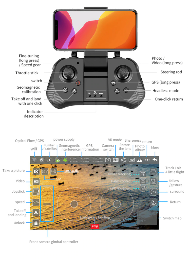- De drone kan schakelen tussen de snelheid: langzaam, normaal en snel.