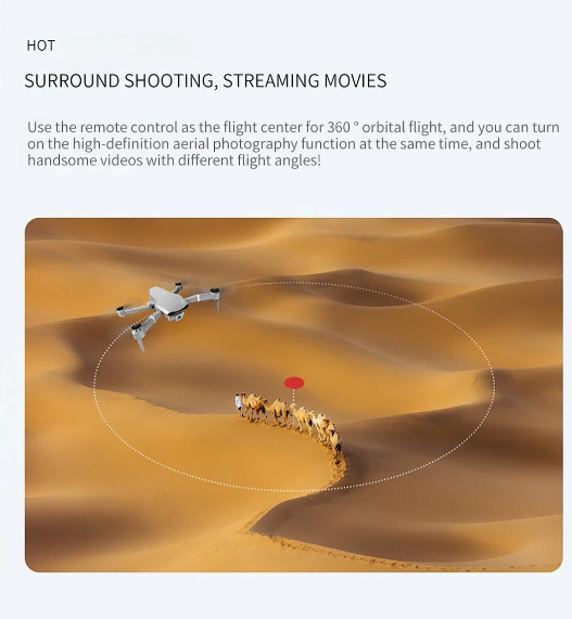 - Met de ”orbitale motion” functie zal de drone vliegen in cirkels. Hiermee kun je nog mooiere foto’s en video’s schieten.