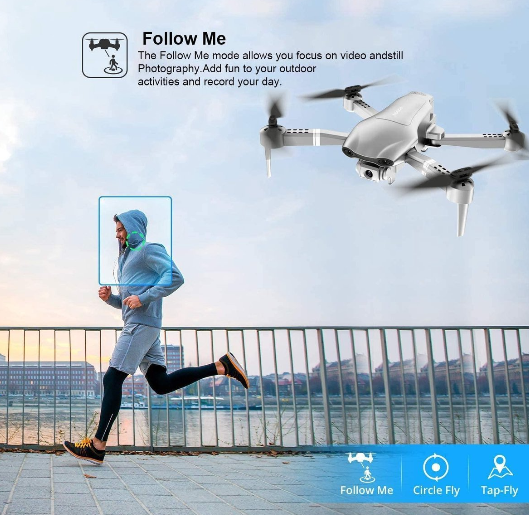 - De drone heeft een ”volg mij” functie. De drone volgt de bewegingen van de bestuurder tot 30 meter.