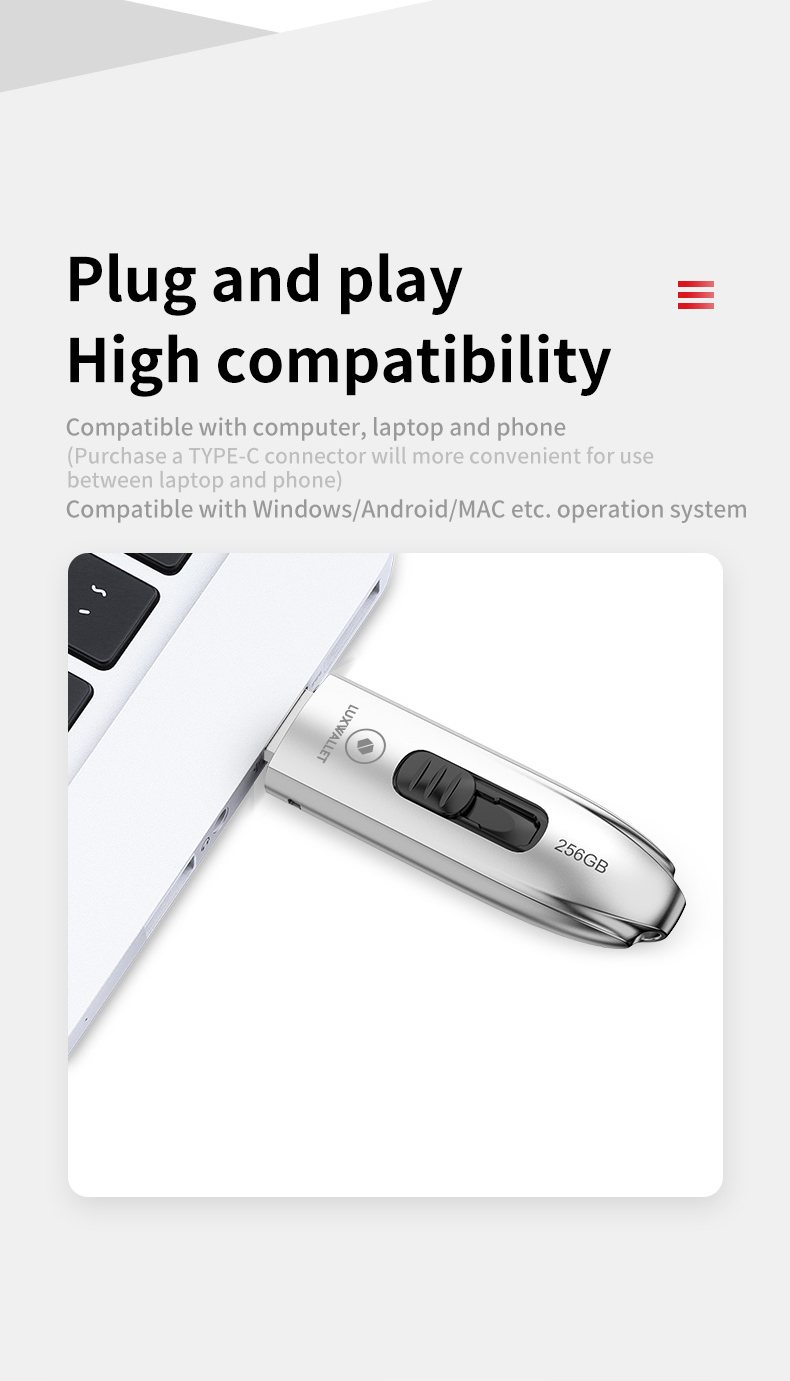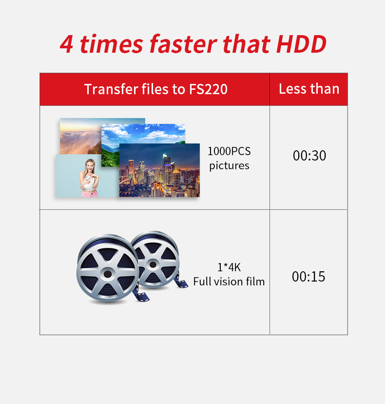 Ultrasnelle overdracht: Met behulp van de USB3.1 ingang is de transmissiesnelheid tot 300MB/sec, de schrijfsnelheid tot 120MB/sec en worden solid-state flashgeheugendeeltjes gebruikt om ultrahoge snelheidsprestaties te bereiken.