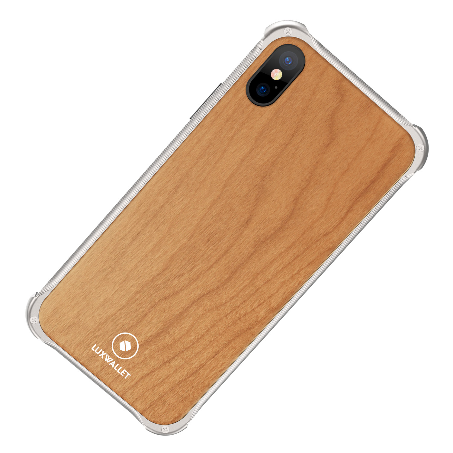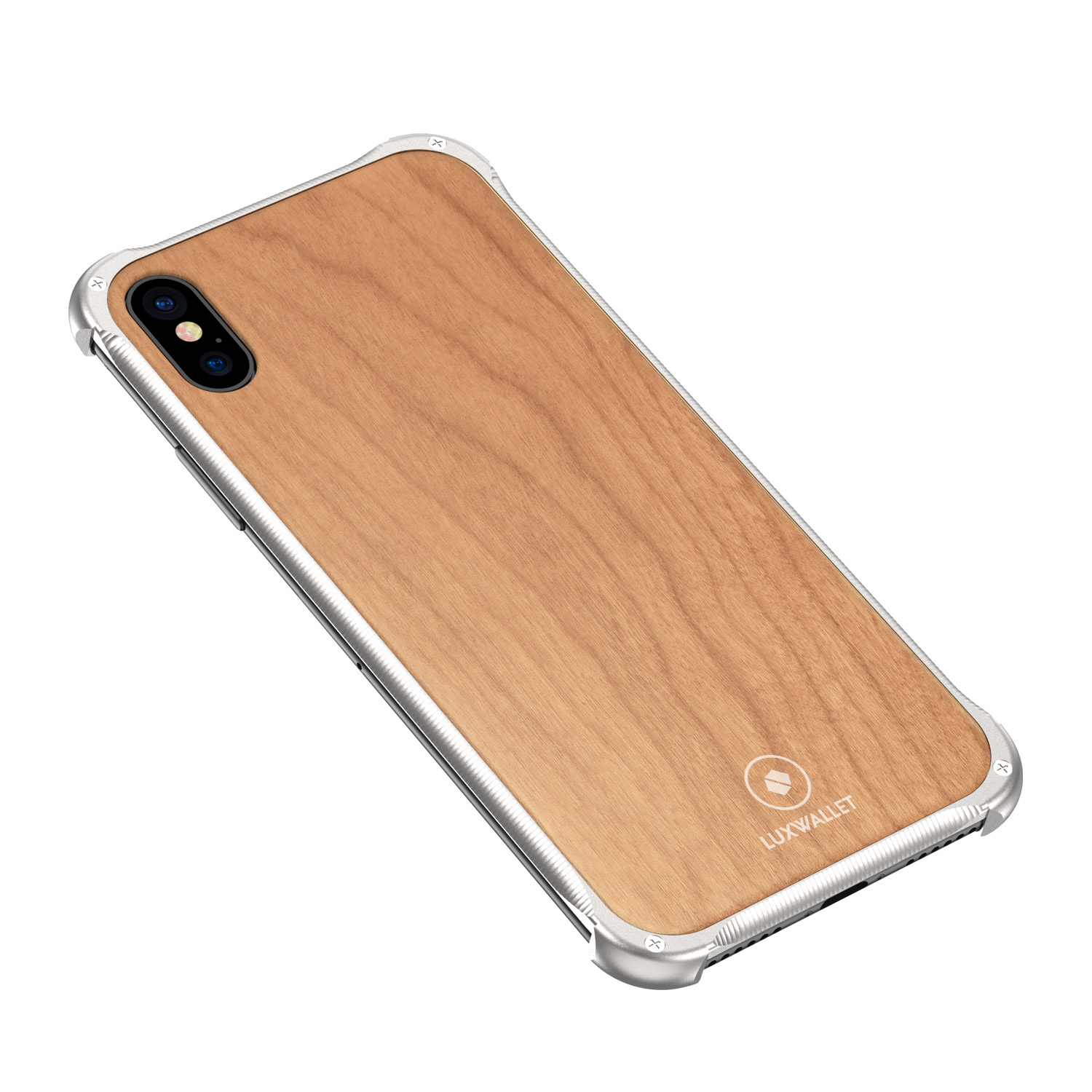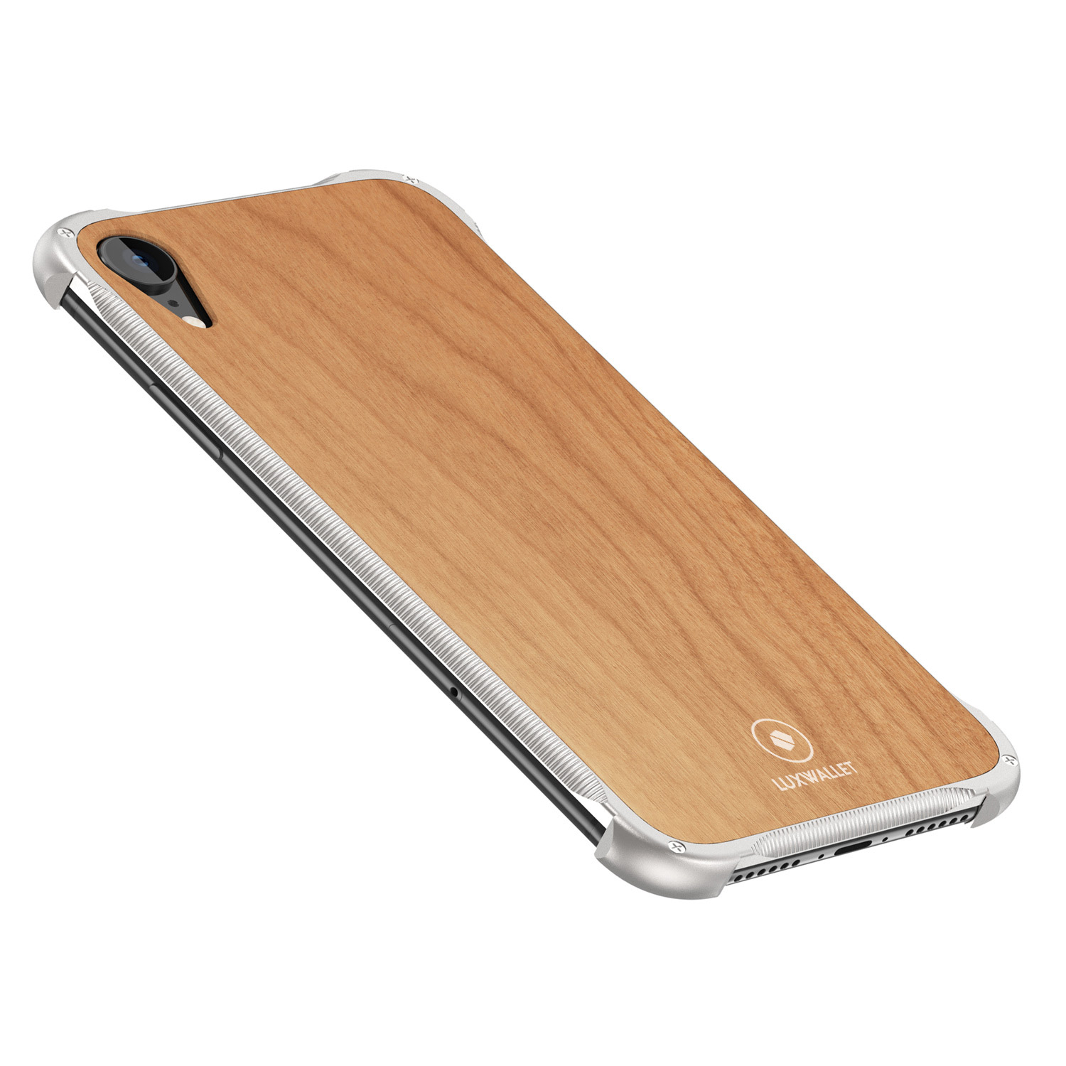 LUXWALLET® RONIN – iPhone XR – Silver + Cherrywood Case – Houten Hoes + Metalen Behuizing met Authentiek Kersenhout