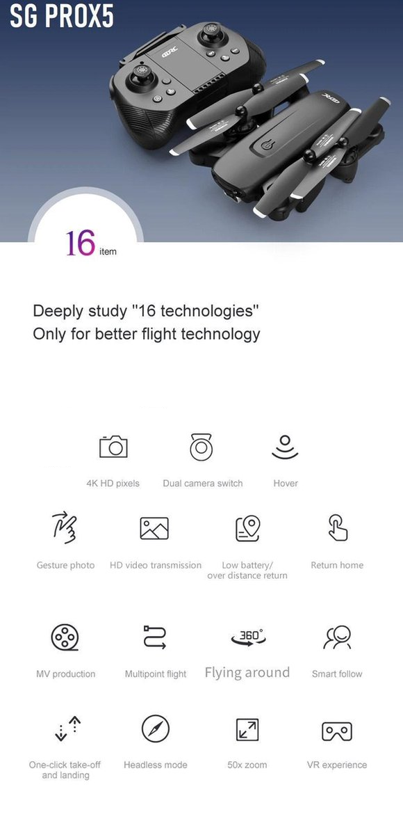 De LUXWALLET SG-ProX5 drone is ontworpen voor beginners. Met deze drone camera kun je als beginner op afstand prachtige video’s en foto’s schieten. Met de meegeleverde afstandsbediening kun je de drone direct gebruiken. Indien je de spektakel ook in real time wilt zien, kun je de bijbehorende applicatie op je smartphone installeren en beeld krijgen op je smartphone. Met de ingebouwde ”Hold modus” hoef je geen zorgen te maken over crashen. De drone zal stabiel in de lucht zweven. Met 1 klik kun je de drone opstarten en weer laten landen.