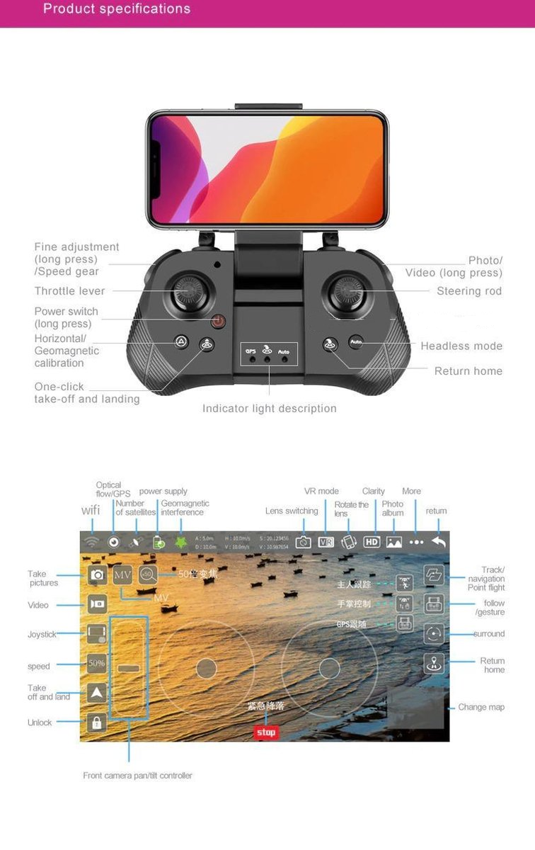 – Mogelijk om de smartphone in een VR bril te stoppen en alles wat de drone ziet in VR omgeving te zien. (exclusief VR bril)