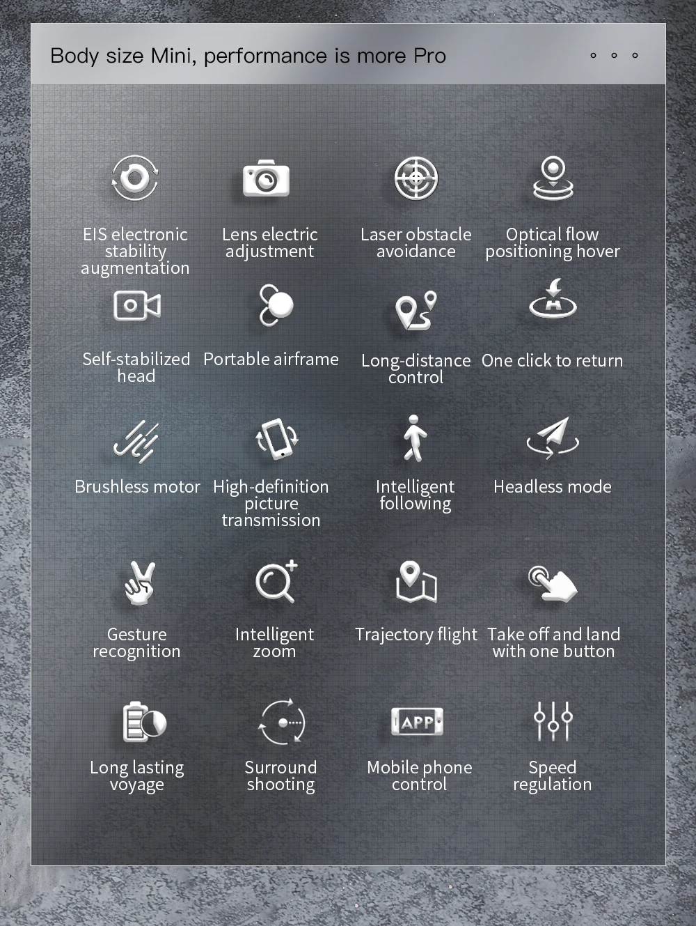 – Optische Vlieg Positionering & Self-Stabilized Head: Voor nauwkeurige, soepele vluchten en scherpere beelden.