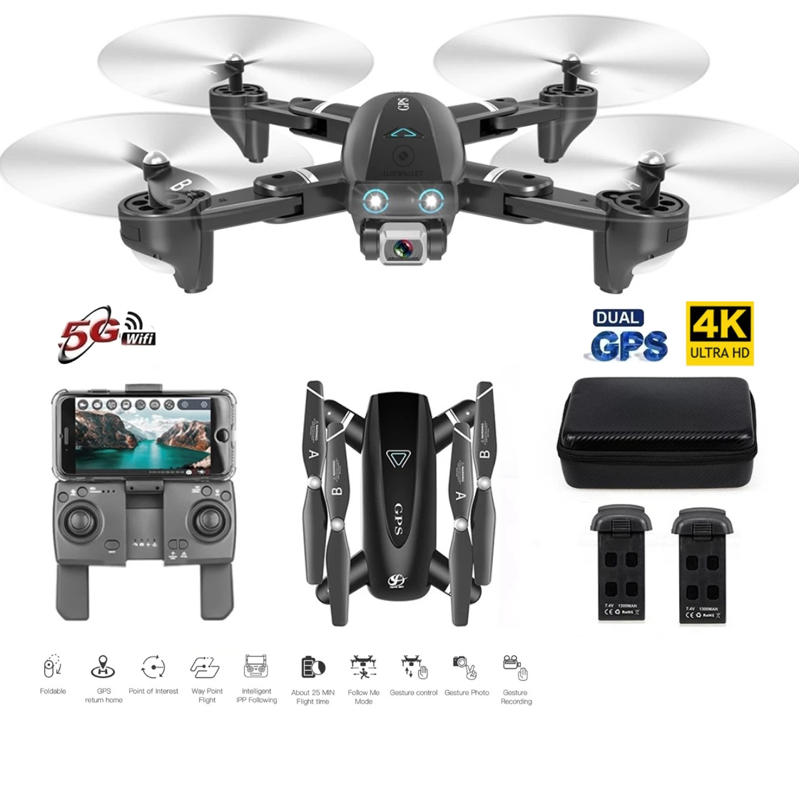 LUXWALLET TT Pro – GPS Drone – 30km/h – 210 Gram – Afstandsbediening – 5Ghz – Camera – Foto – Applicatie + Afstandsbediening