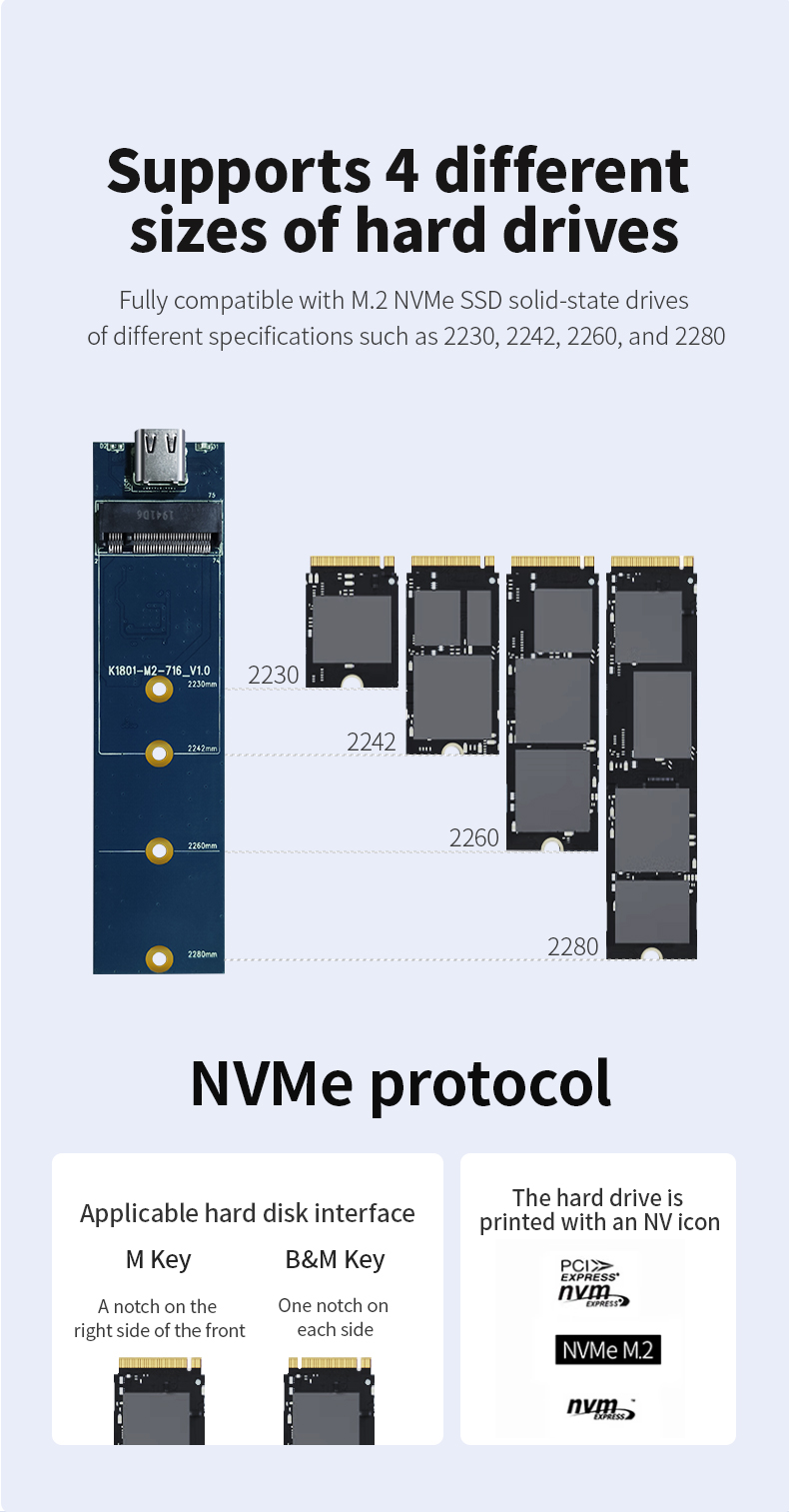 Ondersteunt 4 verschillende formaten: Met zijn ondersteuning voor verschillende formaten NVMe SSD’s, inclusief 2230mm, 2242MM, 2260MM, en 2280MM, biedt de LUXWALLET TurboDrive ultieme flexibiliteit voor al je opslagbehoeften. Het is geschikt voor B&M key en M key.