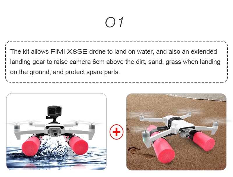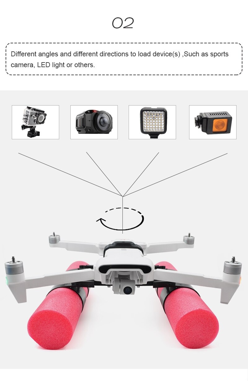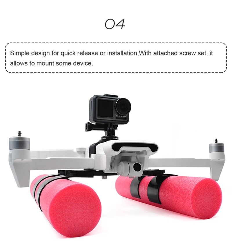 Universele waterlandingsgestel: Met precieze afmetingen en een universele pasvorm. Het kan worden gebruikt als een gewoon landingsgestel en kan ook worden gebruikt als een drijfstang om op te landen het water (Als je op het water landt, zorg er dan voor dat het op een kalm wateroppervlak staat om te voorkomen dat de drone omvalt door grote golven, die de drone kunnen beschadigen).